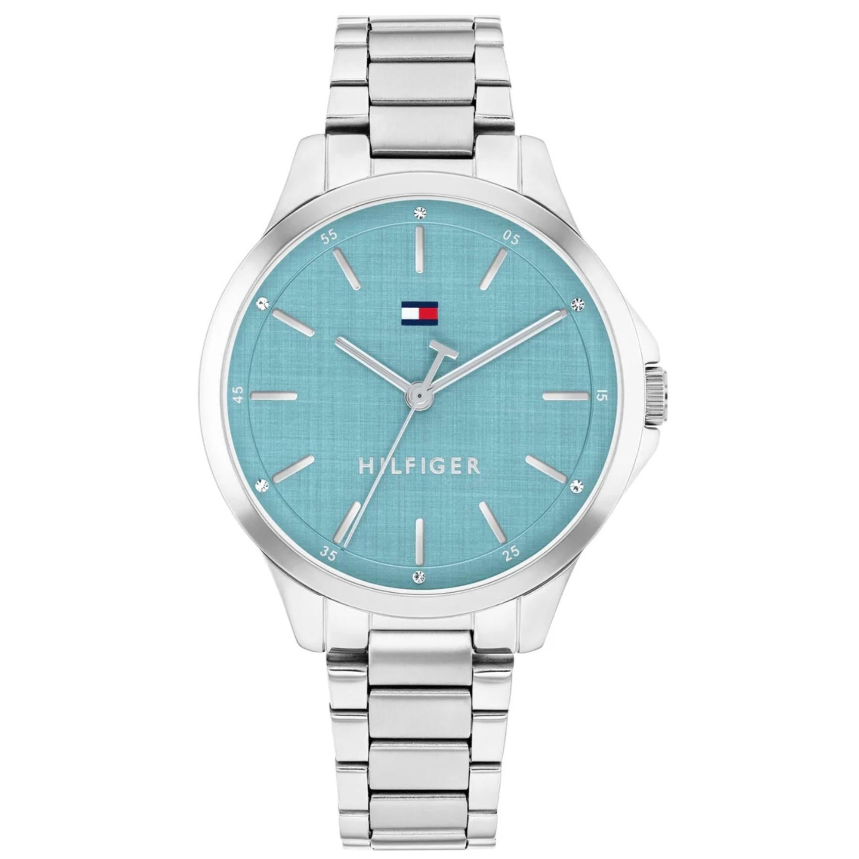 Γυναικείο ρολόι Tommy Hilfiger Chloe 1782826 με ασημί ατσάλινο μπρασελέ και γαλάζιο καντράν διαμέτρου 34mm. Έχει τζαμάκι από ορυκτό κρύσταλλο ειδικής σκλήρυνσης, με μηχανισμό μπαταρίας quartz και είναι αδιάβροχο με στεγανότητα στα 30M/3ΑΤΜ που το καθιστά κατάλληλο για απλή επαφή με το νερό.