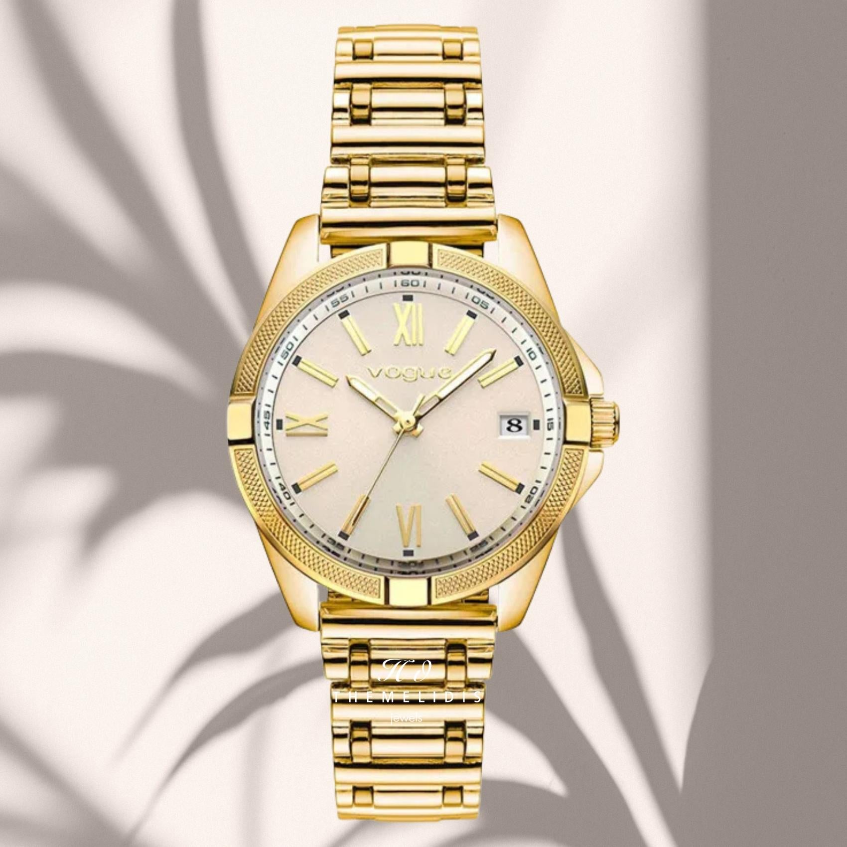 Γυναικείο ρολόι Vogue Liz Mini 2020615941 με χρυσό μπρασελέ από ανοξείδωτο ατσάλι με σαμπανί καντράν, χρυσούς δείκτες και κάσα διαμέτρου 34mm. Έχει τζάμάκι από ορυκτό κρύσταλλο ειδικής σκλήρυνσης, μηχανισμό μπαταρίας quartz και ένδειξη ημερομηνίας. Το ρολόι είναι αδιάβροχο με στεγανότητα στα 100M/10ΑΤΜ που το καθιστά κατάλληλο για κολύμβηση