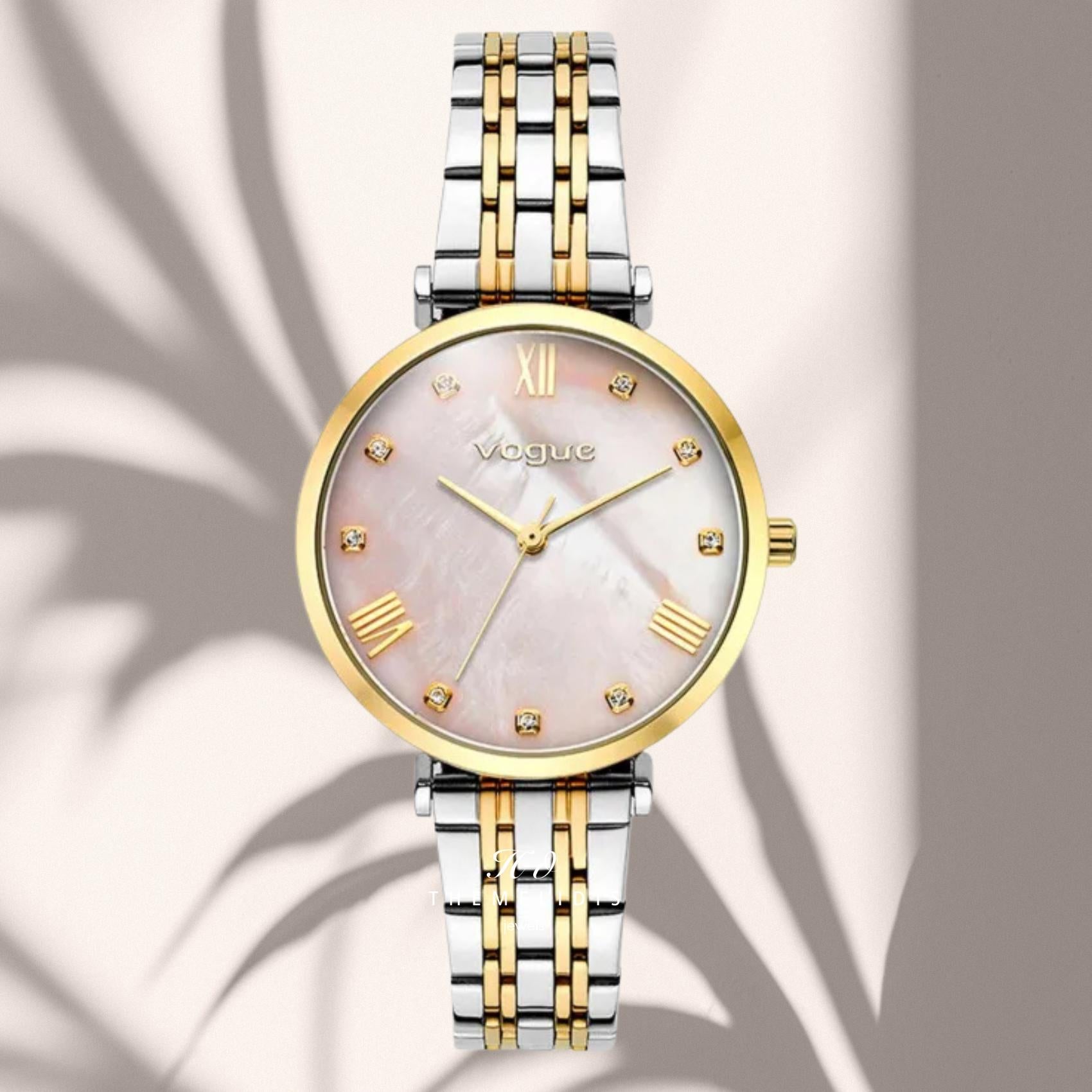 Γυναικείο ρολόι Vogue New Bliss 2020616362 με δίχρωμο μπρασελέ χρυσό - ασημί από ανοξείδωτο ατσάλι και ροζ φίλντισι καντράν διακοσμημένο με λαμπερά ζιργκόν, χρυσούς δείκτες και χρυσή κάσα διαμέτρου 32mm. Έχει τζάμάκι από ορυκτό κρύσταλλο ειδικής σκλήρυνσης και μηχανισμό μπαταρίας quartz. Το ρολόι είναι αδιάβροχο με στεγανότητα στα 30M/3ΑΤΜ που το καθιστά κατάλληλο για απλή επαφή με νερό.
