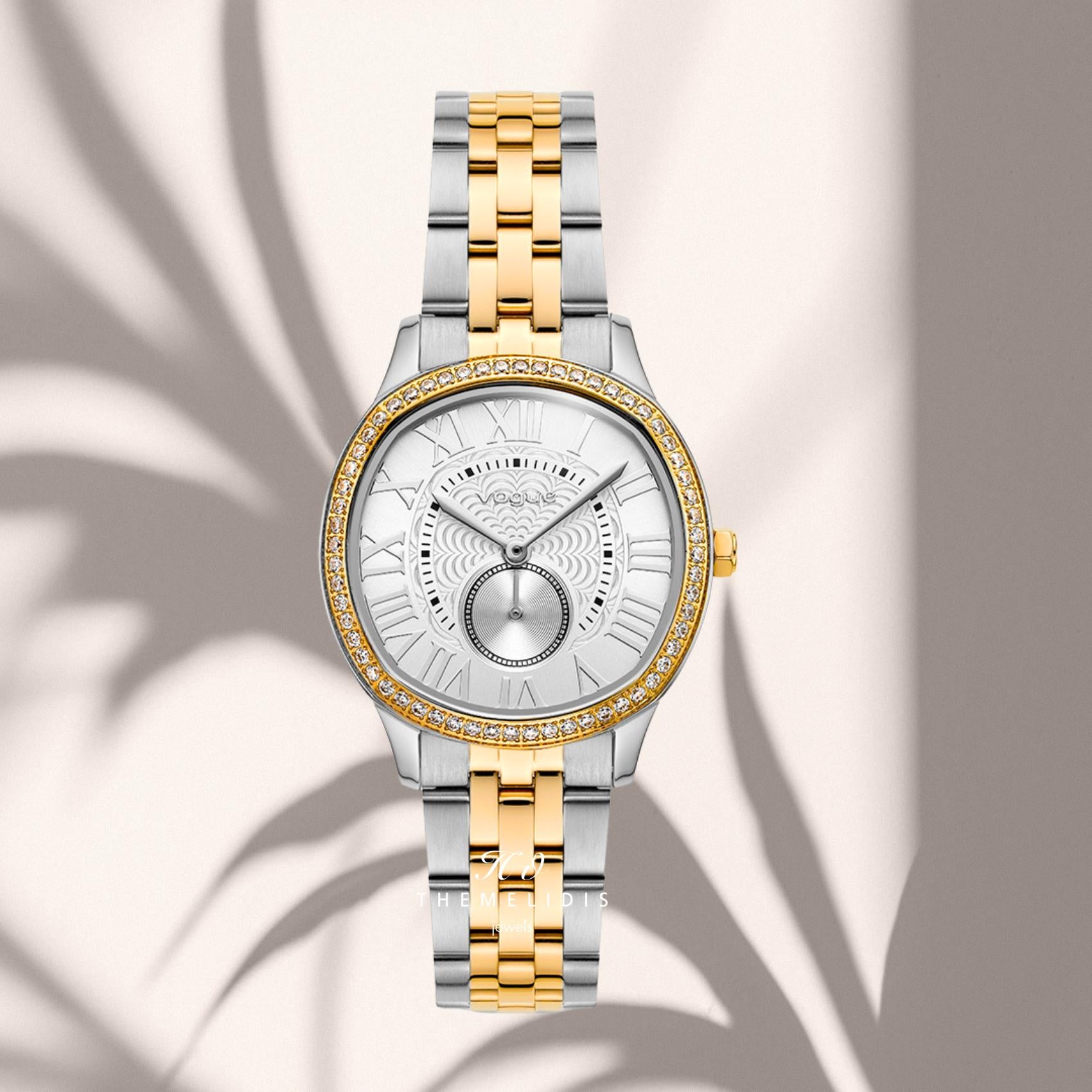 Γυναικείο ρολόι Vogue Yvonne 2020616661 με δίχρωμο ατσάλινο μπρασελέ σε ασημί και χρυσό, ασημί καντράν και ασημί - χρυσή κάσα διαμέτρου 33mm διακοσμημένη με λαμπερά ζιργκόν. Έχει τζαμάκι από ορυκτό κρύσταλλο ειδικής σκλήρυνσης, μηχανισμό μπαταρίας quartz και είναι αδιάβροχο με στεγανότητα στα 30M/3ATM που το καθιστά κατάλληλο για απλή επαφή με το νερό.