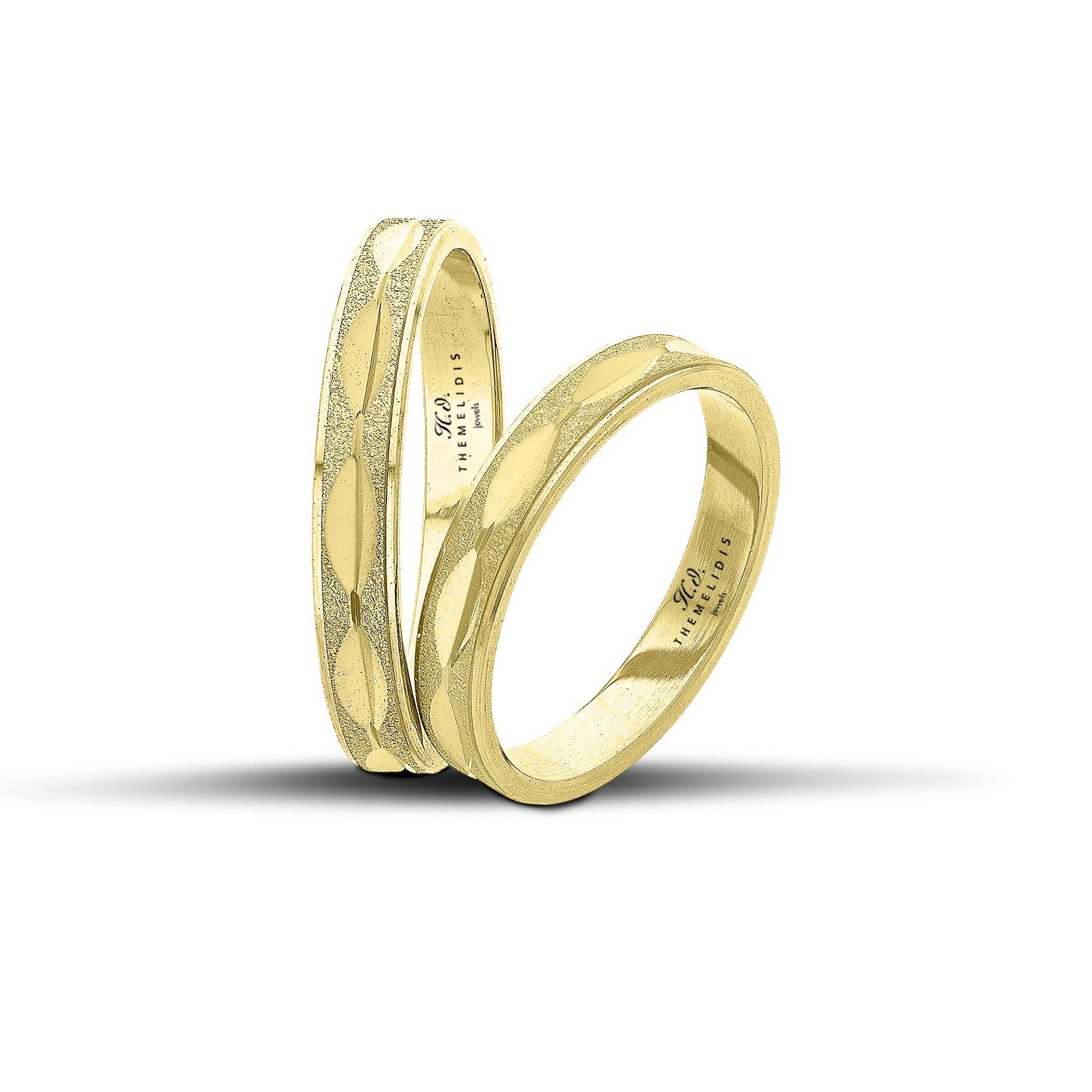 Ένα ζευγάρι μοντέρνες βέρες γάμου χρυσές κατασκευασμένες χειροποίητα για διαχρονική αντοχή. Οι βέρες έχουν ένα περίτεχνο σχέδιο όπου το λουστράτο φινίρισμα εναλλάσσεται με την αμμοβολή. Το συνολικό πλάτος κάθε βέρας είναι στα 3.5mm με ανατομικό σχεδιασμό για επιπλέον άνεση όταν φορεθεί στο δάχτυλο σας.