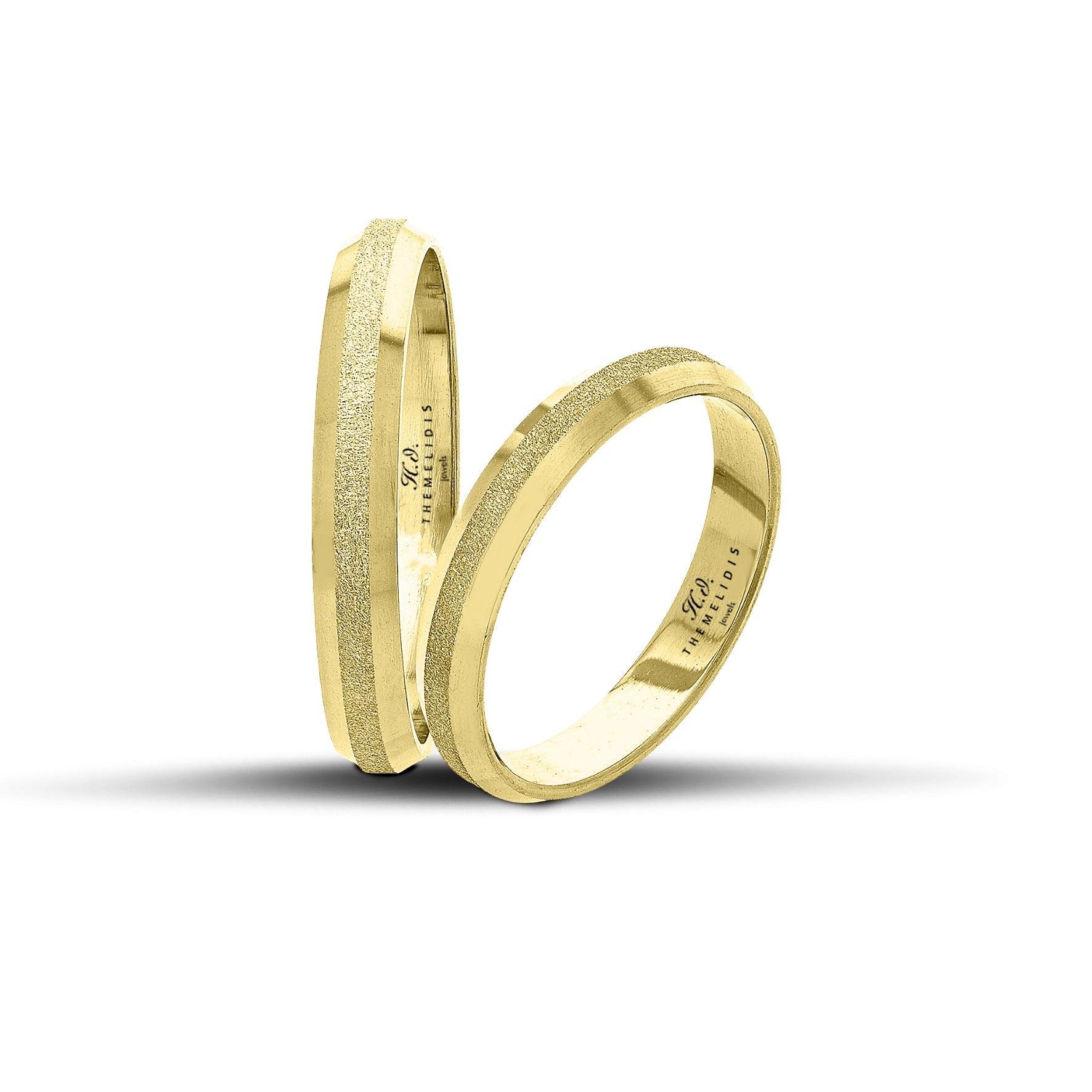 Ένα ζευγάρι μοντέρνες βέρες γάμου χρυσές και τρίεδρες κατασκευασμένες χειροποίητα για διαχρονική αντοχή. Οι βέρες έχουν τριγωνικές ανισόπεδες άκρες που αναδυκνύουν την ματ επιφάνεια από το τελικό φινίρισμα αμμοβολής στη βέρα . Κάθε δαχτυλίδι έχει συνολικό πλάτος 3.5mm με ανατομικό σχεδιασμό για επιπλέον άνεση όταν φορεθεί στο δάχτυλο σας.