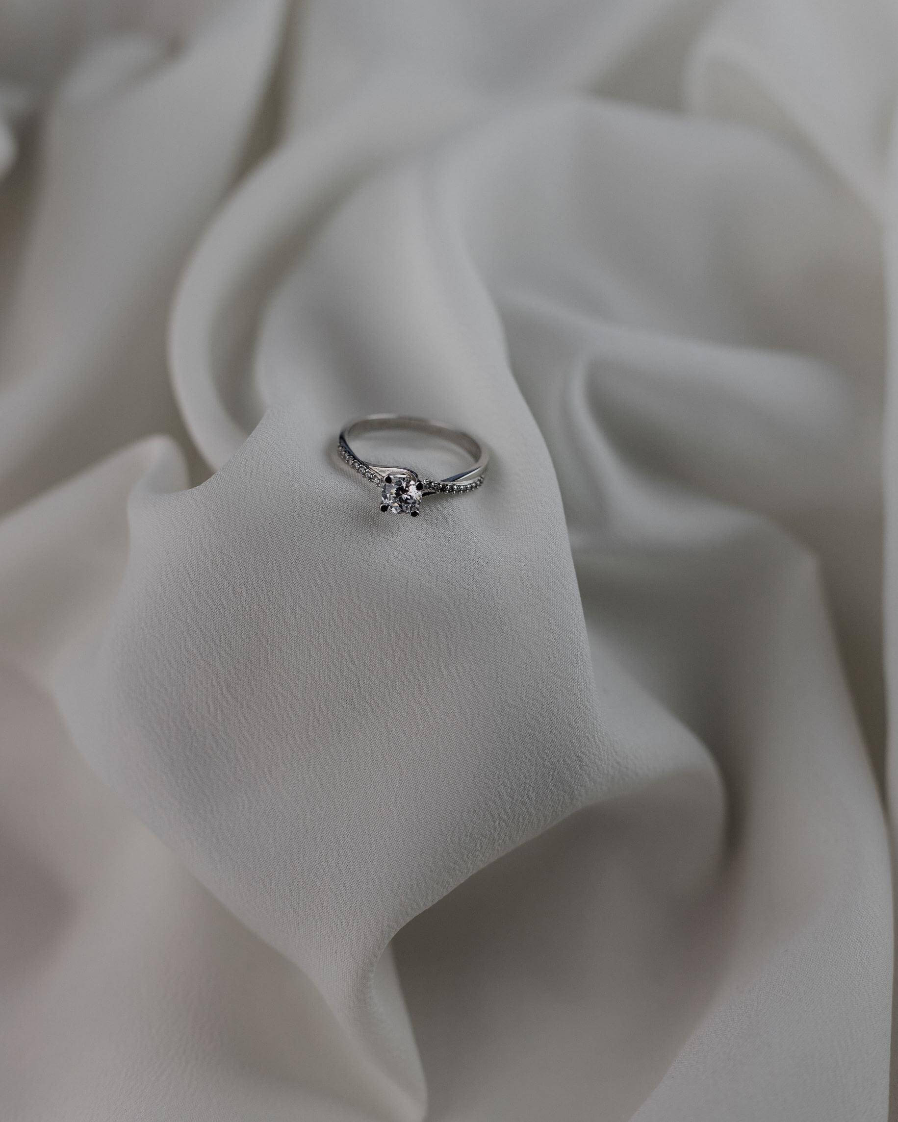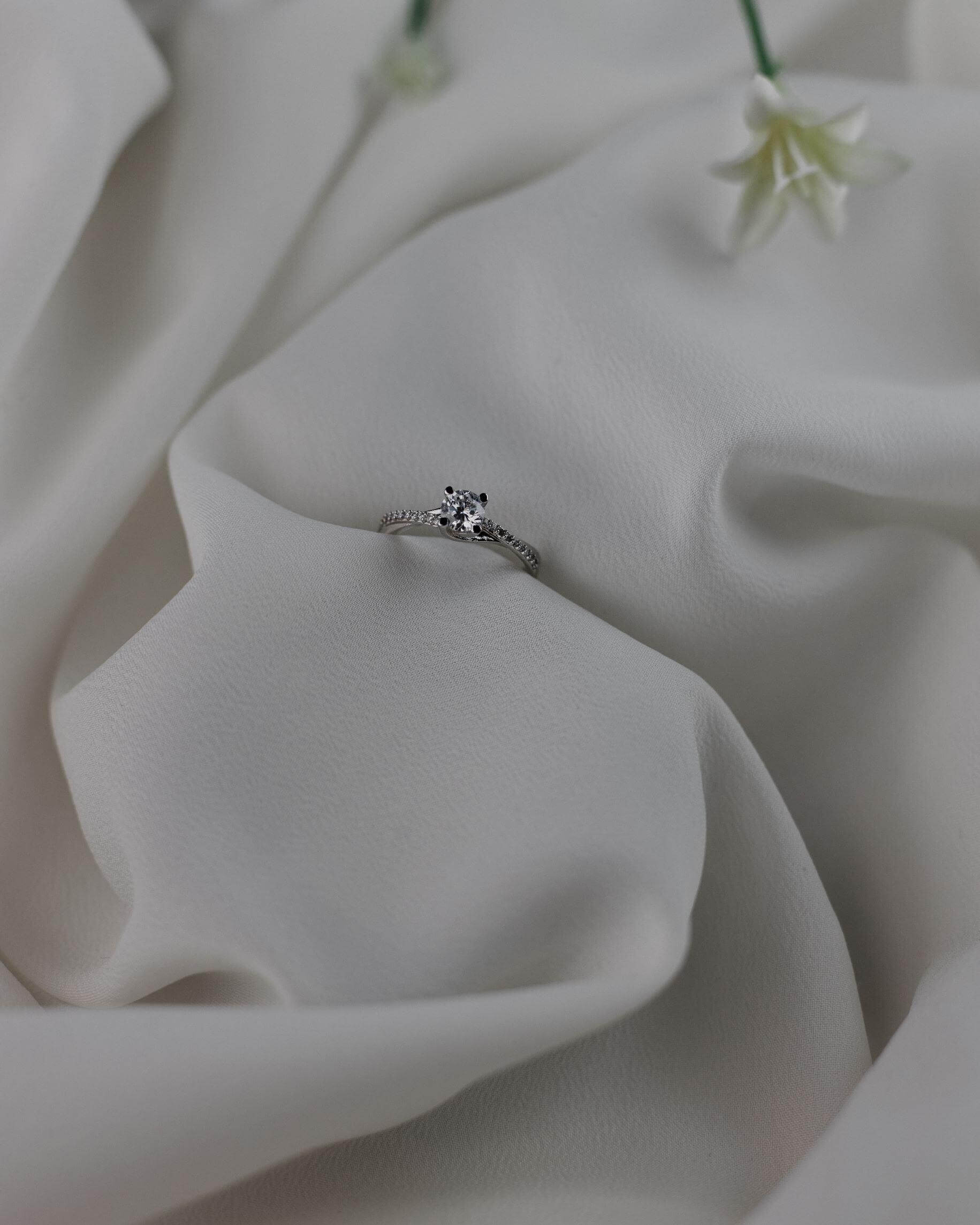 Μονόπετρο δαχτυλίδι φλόγα με διαγώνια πλέξη και πλαϊνές πέτρες, κατασκευασμένο από λευκόχρυσο 14 καρατίων και ζιργκόν υψηλής ποιότητας. Συνδυάζει την κλασική κομψότητα με μια ιδιαίτερη λεπτομέρεια που το κάνει μοναδικό.