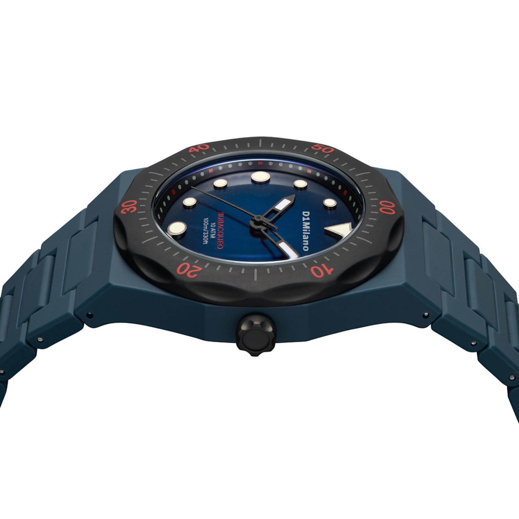 Ρολόι D1 Milano Carbon Diver D1-PDBJ02 με μπλε πολυκαρμπονικό μπρασελέ και μπλε καντράν διαμέτρου στα 40.5mm σε οκτάγωνο σχήμα, με γκρι, λευκές και κόκκινες λεπτομέρειες. Λειτουργεί με μηχανισμό μπαταρίας quartz TMI VJ21 και έχει κρύσταλλο από ορυκτό ειδικής σκλήρυνσης με αντιθαμβωτική επίστρωση. Το ρολόι είναι αδιάβροχο με στεγανότητα στα 100M/10ΑΤΜ που το καθιστά κατάλληλο για κολύμβηση.