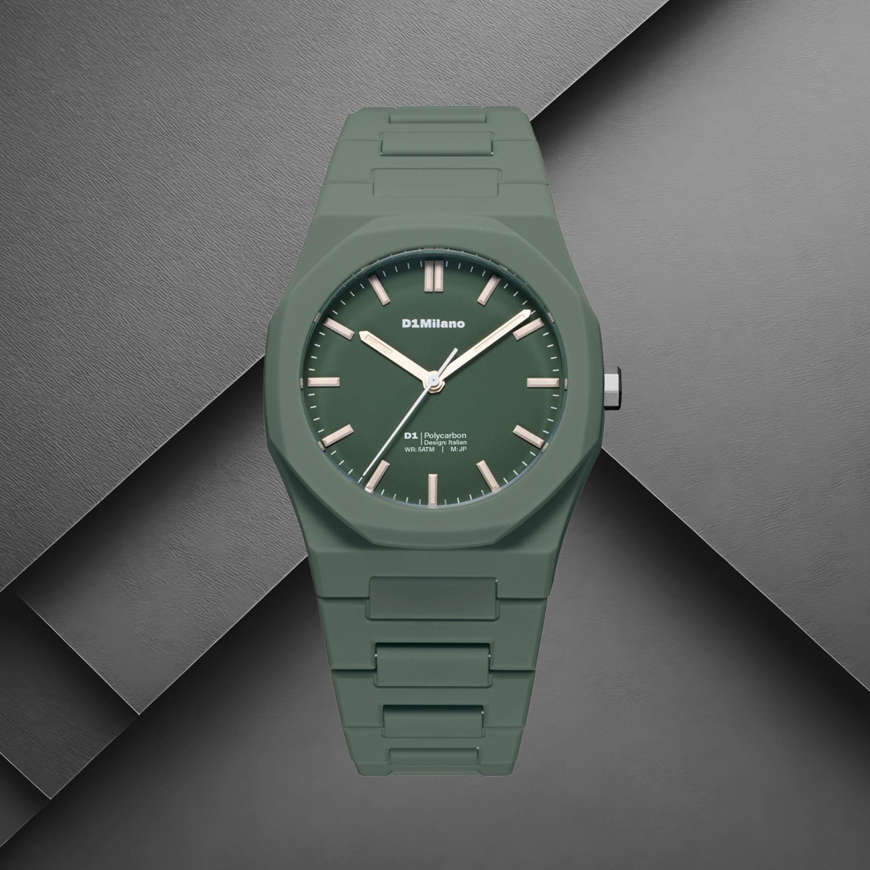 Unisex ρολόι D1 Milano Green Legacy D1-PCBJ42 με πράσινο πολυκαρμπονικό μπρασελέ και πράσινο καντράν διαμέτρου 40.5 mm. Το ρολόι διαθέτει κρύσταλλο από ορυκτό ειδικής σκλήρυνσης, μηχανισμό μπαταρίας quartz TMI VJ21 και στεγανότητα στα 50M/5ΑΤΜ που το καθιστά κατάλληλο για κολύμβηση. Ο μοναδικός οκτάγωνος σχεδιασμός του αναδεικνύει τον σύγχρονο χαρακτήρα του και το κάνει ιδανικό για όσους αναζητούν ένα ρολόι με ποιότητα και ξεχωριστό design.