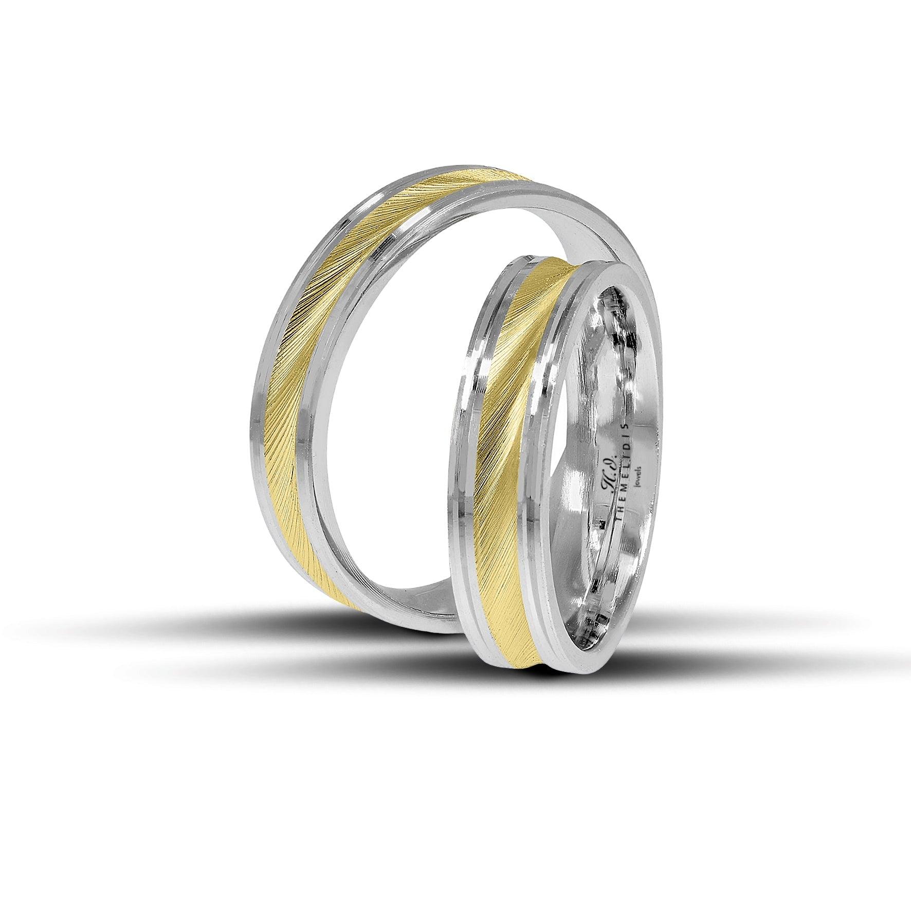 Πρωτότυπες βέρες γάμου από λευκόχρυσο και χρυσό αποτελούν έναν υπέροχο συνδυασμό λάμψης και λεπτομέρειας. Το λουστρέ φινίρισμα χαρίζει εκτυφλωτική φωτεινότητα, ενώ οι διαμανταρισμένες γραμμές δημιουργούν ένα δυναμικό παιχνίδι φωτός που αλλάζει ανάλογα με τη γωνία θέασης. Με πλάτος 5 mm, οι βέρες αυτές προσφέρουν εντυπωσιακή παρουσία.