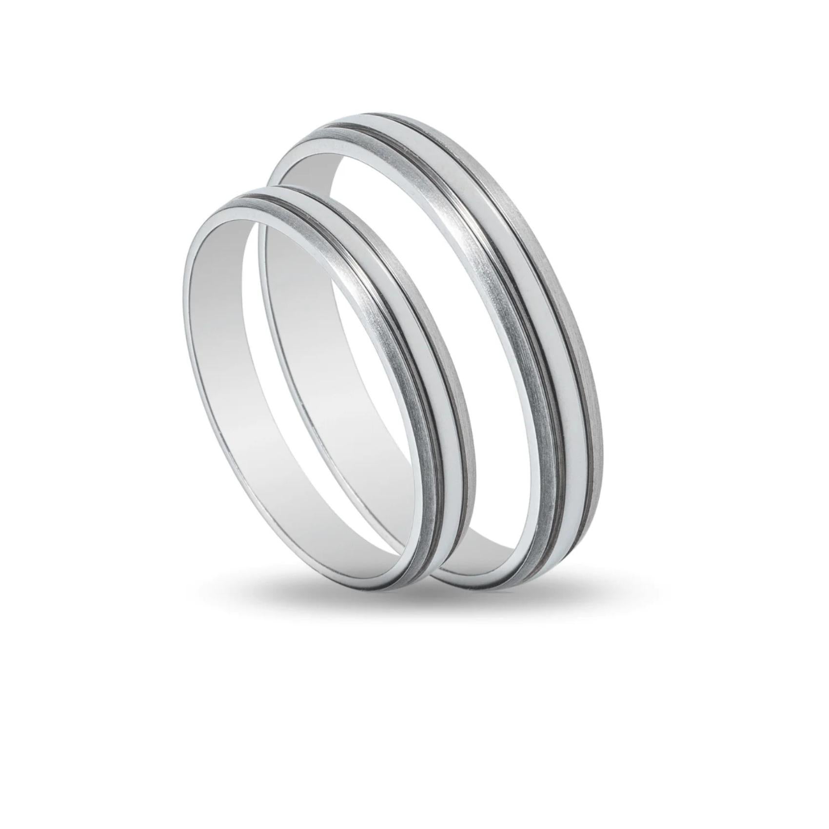 Οι λευκόχρυσες βέρες γάμου Maschio Femmina SL81 ξεχωρίζουν για την καθαρή, σύγχρονη αισθητική τους και τη φωτεινή λάμψη του λευκόχρυσου. Με πλάτος 3.5 mm, το σετ έχει ισορροπημένη παρουσία στο χέρι και φοριέται άνετα στην καθημερινότητα. Οι διακριτικές γραμμές κατά μήκος της βέρας δημιουργούν ένα λεπτό παιχνίδι φωτός, προσθέτοντας χαρακτήρα χωρίς υπερβολές.