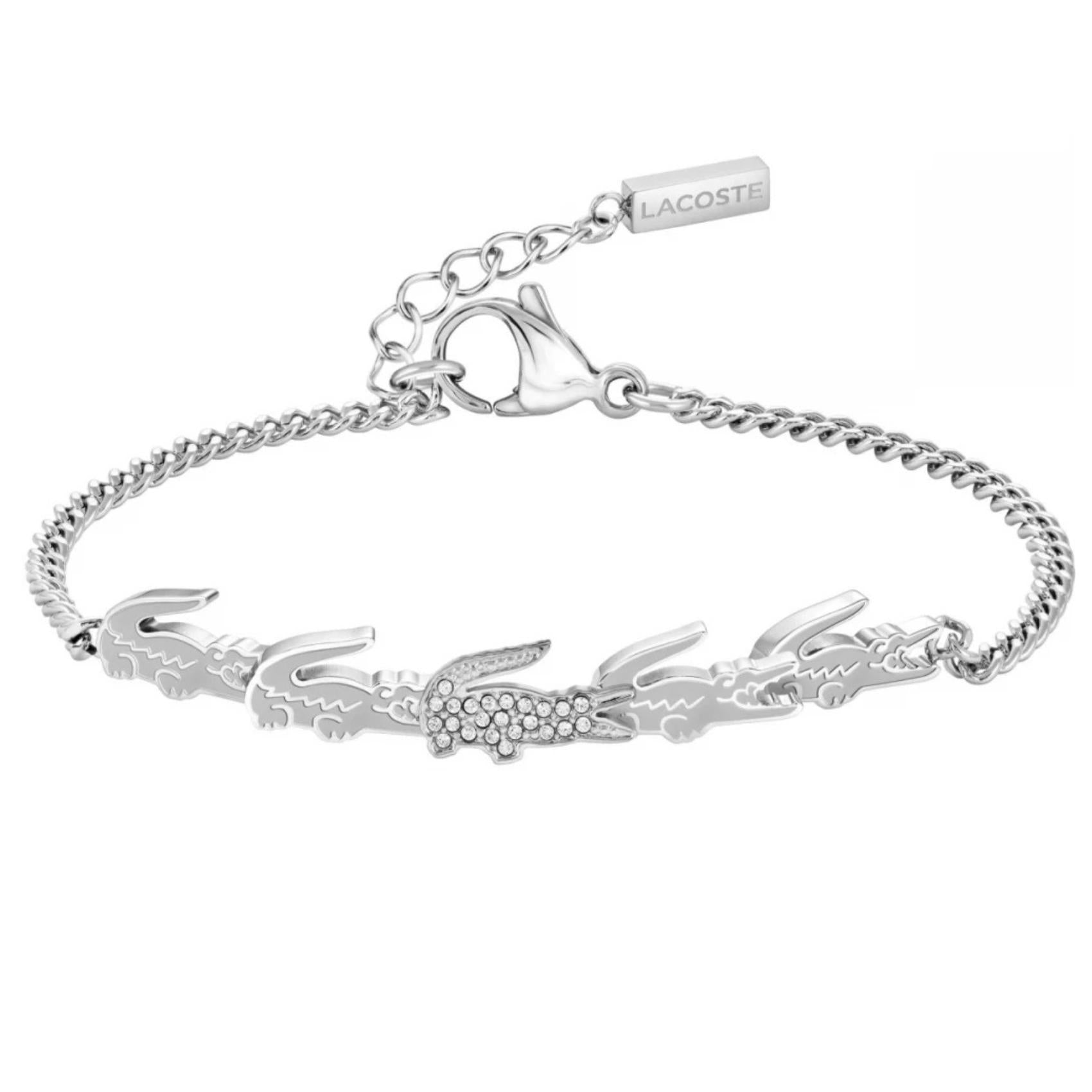 Γυναικείο Βραχιόλι Lacoste 2040509 με ζιργκόν. Το βραχιόλι είναι κατασκευασμένο από ανοξείδωτο ατσάλι σε ασημί χρώμα και διαθέτει μια λεπτή αλυσίδα διακοσμημένη με τα iconic σύμβολα του brand, τους κροκόδειλους. Το μήκος της αλυσίδας είναι ρυθμιζόμενο στα 18-22cm με δυνατότητα προσαρμογής στο χέρι. Αποστέλλεται σε συσκευασία δώρου, με πιστοποιητικό γνησιότητας από την επίσημη αντιπροσωπεία της Lacoste.